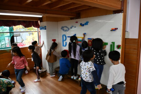 ホールに「Bブロックラボ」(ブロックで構成遊びが楽しめるコーナー)が完成し、大人気のコーナーになっています。